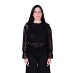 La blusa manga larga en tull plumeti negro de Tiare para mujer es una prenda elegante y sofisticada, perfecta para un look formal o de ocasión especial. Presenta un cuello alto con volantes que añade un toque romántico y delicado, mientras que los detalles fruncidos en el área del pecho realzan la silueta. La blusa se completa con mangas largas y puños elásticos que aportan comodidad y estilo, y un pequeño volante en la cintura que genera un acabado femenino y moderno.
