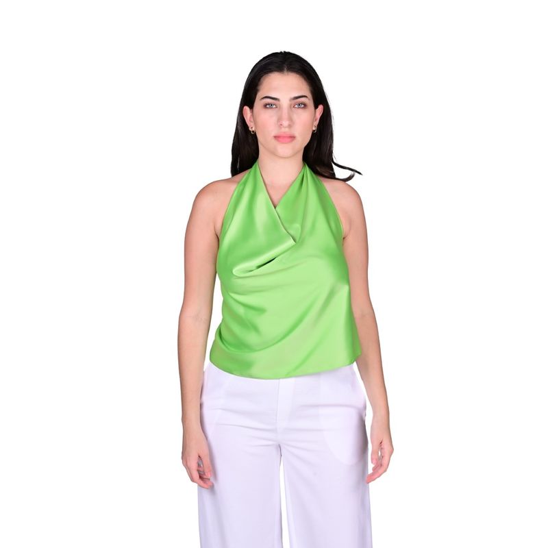 La Blusa Satinada Halter Con Espalda Descubierta Verde Mujer Juliette es una prenda sofisticada y versátil, diseñada para realzar la feminidad con un toque moderno y elegante. Su estilo halter sin mangas deja los hombros al descubierto, mientras que el escote de caída tipo cowl (drapeado) aporta volumen y movimiento al frente, creando un efecto visual delicado y fluido.