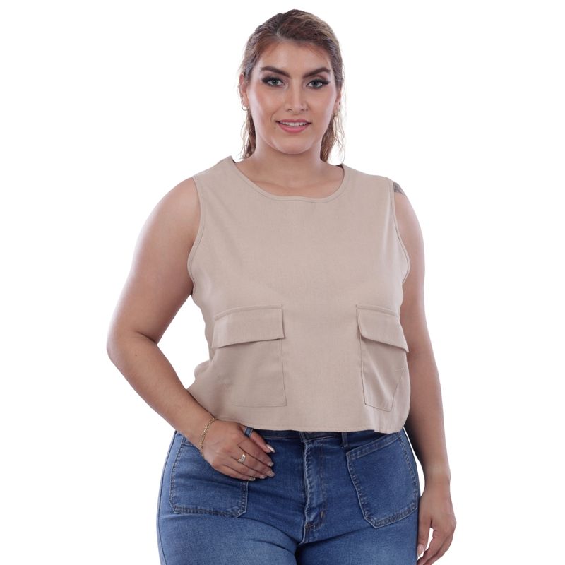 La Blusa Sin Mangas Beige Con Bolsillos de Lino de Susan Miller combina elegancia y funcionalidad con un diseño moderno y versátil. Su corte holgado y largo cropped con bajo recto permite un look relajado y a la vez sofisticado, ideal para el día a día o eventos casuales. El cuello redondo aporta un toque clásico, mientras que los dos bolsillos grandes con solapa en el pecho destacan como detalle práctico y de estilo.