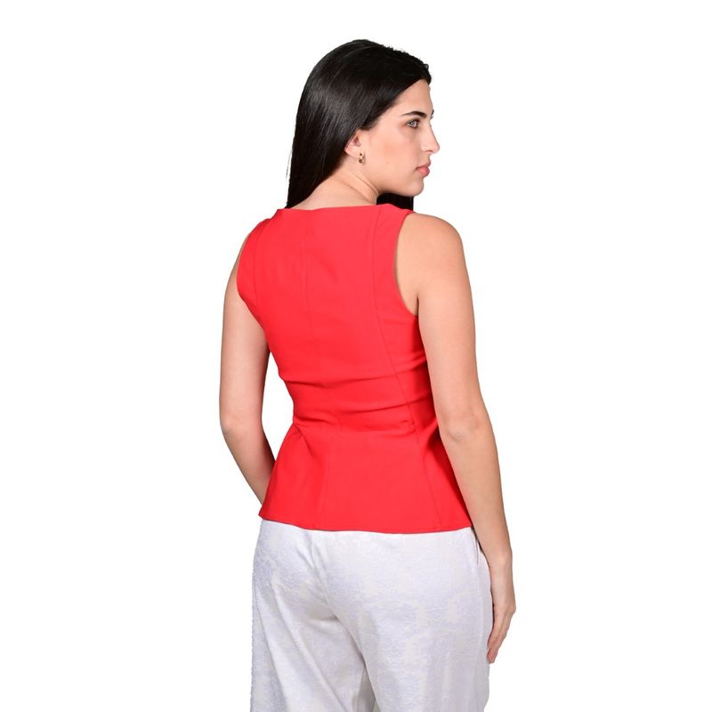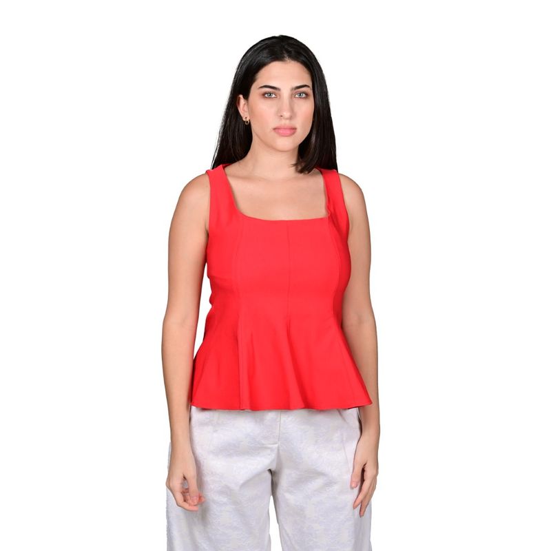 La Blusa Sin Mangas Con Nejas Estilo Peplum Rojo Mujer L'exclusif combina elegancia, modernidad y estructura para un look femenino y sofisticado. Su corte entallado en el torso, reforzado con costuras de sastre, realza la figura y aporta un efecto visual definido y armonioso. El escote cuadrado y moderno resalta el cuello y los hombros, aportando un toque contemporáneo que complementa el estilo peplum.