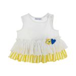 Volante inferior fruncido de doble capa, con la capa superior blanca y la inferior con rayas blancas y amarillas, que aporta un toque divertido y elegante.