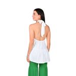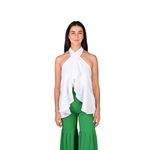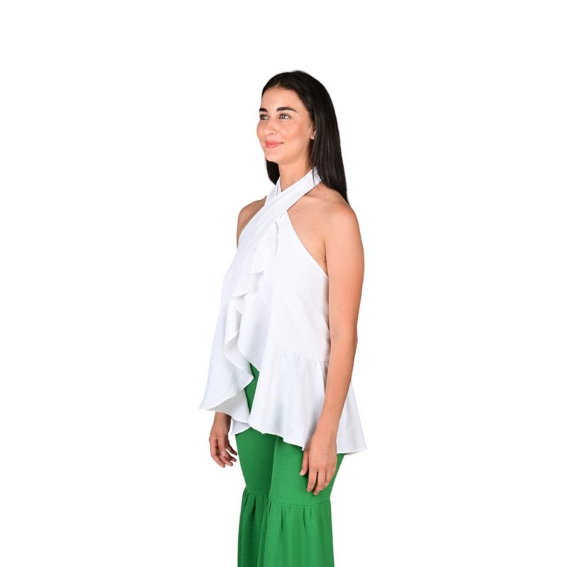 Blusa femenina de diseño sofisticado y actual, ideal para destacar el look con un toque elegante. Presenta cuello halter cruzado y atado en la nuca, que realza la zona superior y deja la espalda descubierta, aportando un estilo delicado y moderno. Los volados frontales en cascada suman movimiento y fluidez, mientras que el corte suelto en el bajo brinda una caída natural y favorecedora.