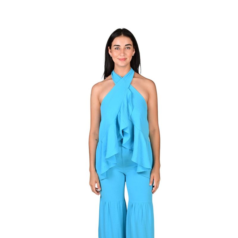 La blusa sin mangas L'exclusif es una prenda pensada para mujeres que buscan un equilibrio entre elegancia y estilo actual. Su diseño destaca por el escote en V, que realza la parte superior del cuerpo, y por los volantes frontales en cascada que aportan movimiento y un toque sofisticado. Es una opción ideal para elevar cualquier outfit con un aire femenino y delicado.