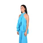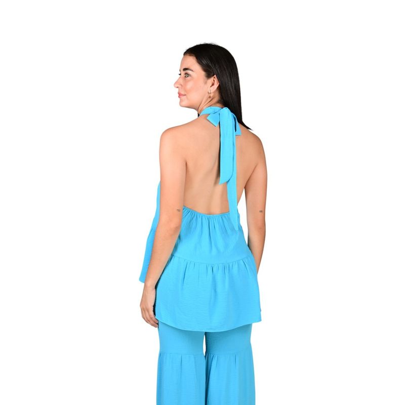 El diseño de espalda descubierta con cierre de lazada al cuello suma un detalle distintivo y moderno, mientras que el bajo asimétrico de estilo peplum fluido acompaña la silueta de forma natural, brindando comodidad y una caída favorecedora.
