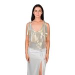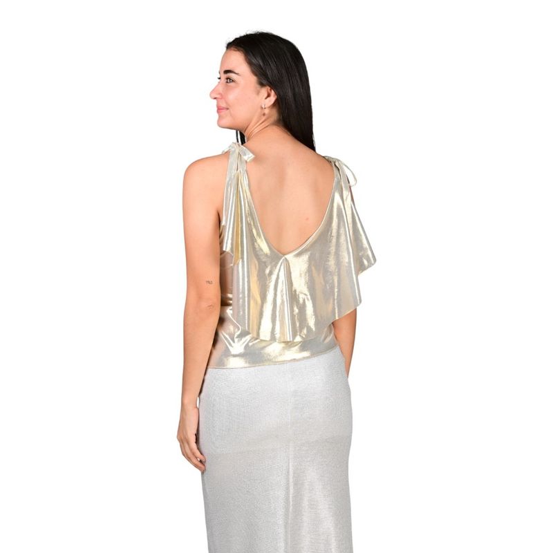 Blusa elegante sin mangas confeccionada en lurex dorado, que aporta un brillo sofisticado y llamativo. Presenta un cuello en V que resalta el escote y volados frontales que brindan movimiento y un toque femenino, ideal para eventos especiales o salidas nocturnas.