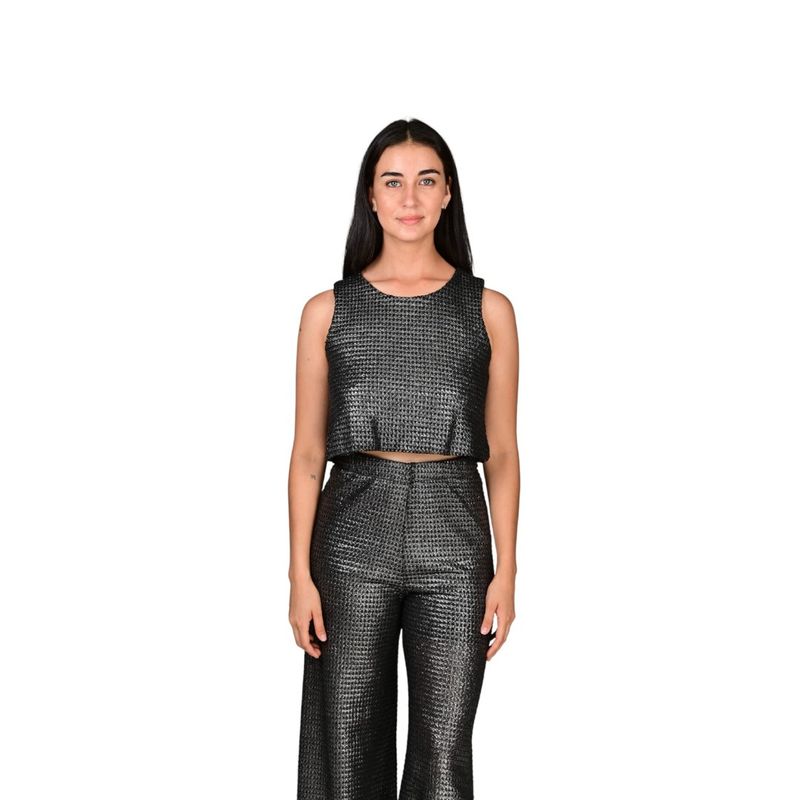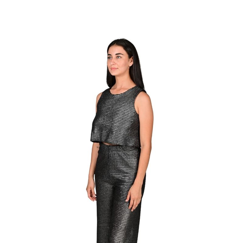 Blusa elegante sin mangas confeccionada en red negra, ideal para lucir un look sofisticado y moderno. Su diseño ligero y versátil permite combinarla fácilmente con diferentes prendas, adaptándose tanto a ocasiones casuales como a eventos especiales.