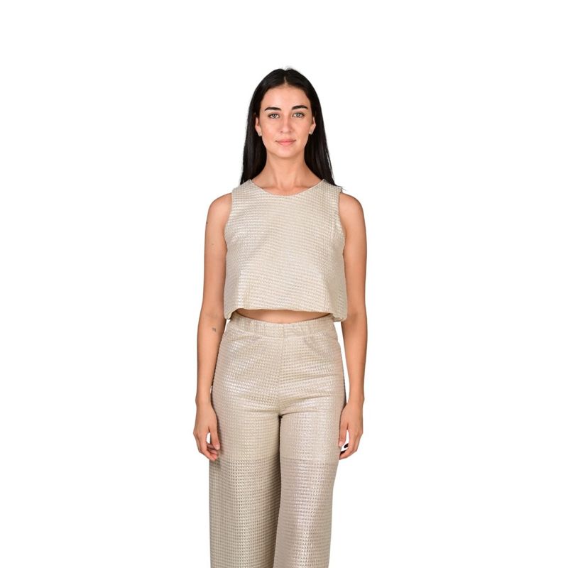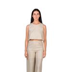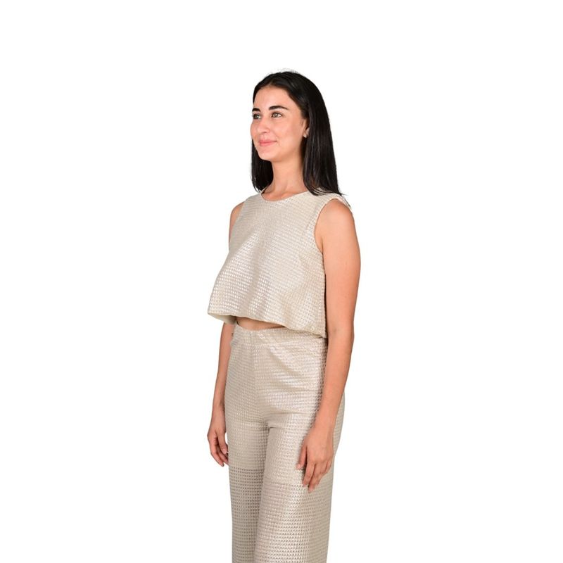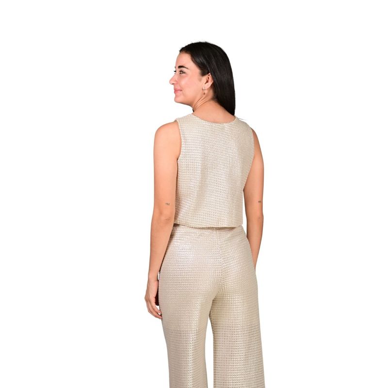 Esta blusa sin mangas en red plata presenta un diseño moderno y llamativo, ideal para quienes buscan una prenda con personalidad y estilo actual. Su estructura liviana aporta un efecto visual atractivo, realzando el look con un toque sofisticado y contemporáneo, perfecto para distintas ocasiones.