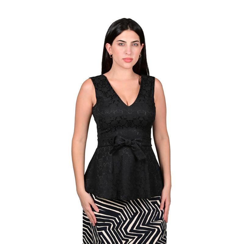 La Blusa Sin Mangas Estilo Peplum De Brocato Con Pinza Negro de Juliette es una prenda sofisticada y femenina, diseñada para resaltar la silueta con elegancia. Su corte peplum define la cintura, mientras que el escote en V delantero y trasero aporta un toque moderno y atractivo. El lazo decorativo en el frente permite ajustar y personalizar el look según tu estilo, ofreciendo versatilidad y distinción.