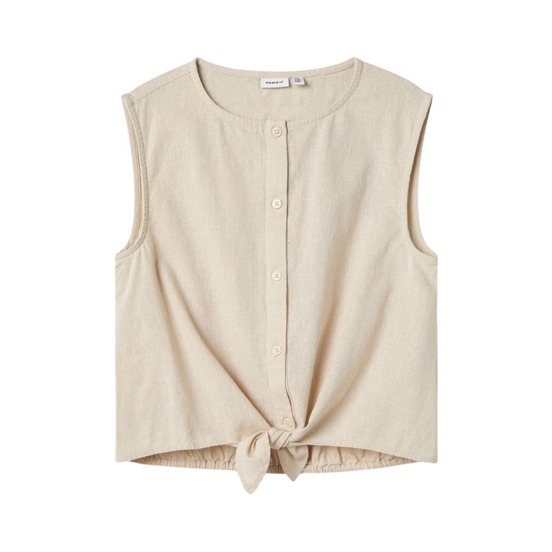 La Blusa Sin Mangas Lino Niña de Name It es una prenda versátil y elegante, ideal para los días de primavera y verano. Su diseño limpio y clásico, con cuello redondo y botonadura frontal, combina comodidad con un toque moderno. El detalle de nudo en la parte delantera añade un acento sofisticado, mientras que la ausencia de mangas permite total libertad de movimiento, perfecta para jugar, explorar y disfrutar de actividades al aire libre. El tejido con patrón entrecruzado y superficie ligeramente texturizada aporta un acabado refinado y de calidad, ideal para looks casuales o más formales.