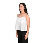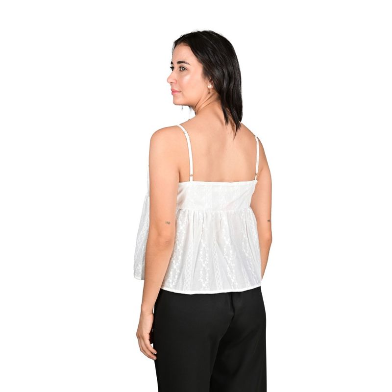 Esta blusa solera de broderi en color marfil combina delicadeza y elegancia en un diseño femenino. Presenta tirantes finos y escote en V, con corte péplum que realza la cintura y aporta volumen ligero en la parte inferior, generando un efecto sofisticado y estilizado. El detalle de bordado en el tejido añade un toque romántico y artesanal, haciendo de esta prenda una opción ideal tanto para eventos diurnos como nocturnos.