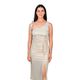 Blusa de un solo hombro en lurex dorado, con un diseño moderno y sofisticado. Presenta un lazo anudado en el hombro que agrega un detalle elegante, cintura drapeada que estiliza la figura y tajo lateral que aporta movimiento y un toque de distinción.