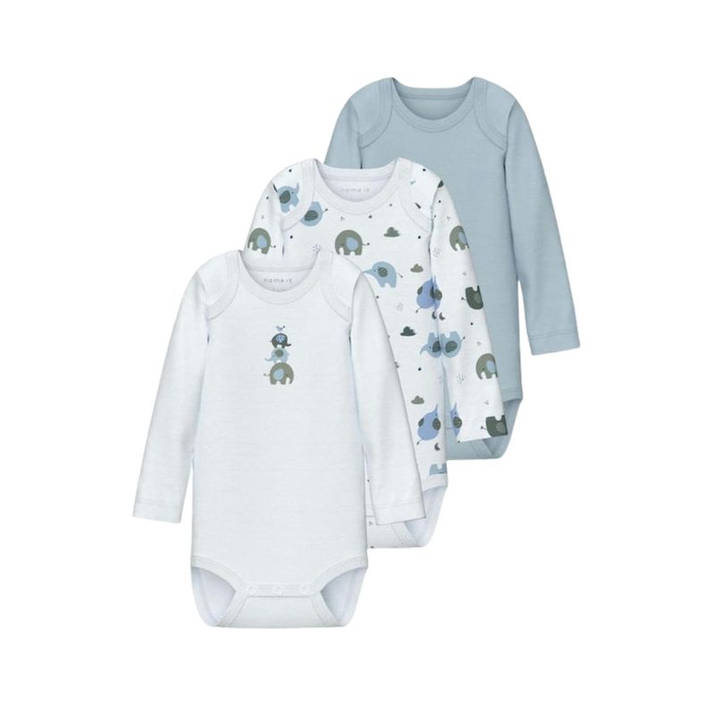Este conjunto de bodies de la marca Name It ofrece practicidad y ternura para los más pequeños. El pack incluye tres diseños únicos que combinan funcionalidad con adorables estampados temáticos de elefantes.