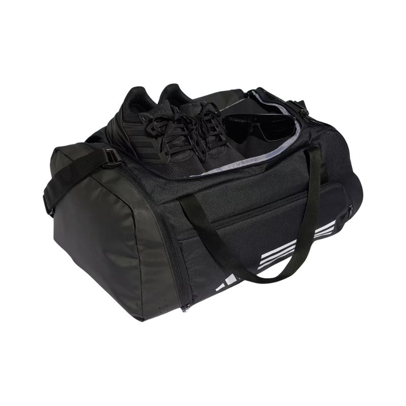 Fabricado con 100 % poliéster reciclado, este bolso deportivo refleja el compromiso de Adidas con la sostenibilidad, utilizando al menos un 50 % de materiales reciclados. Esto reduce la generación de residuos y disminuye la dependencia de recursos finitos, contribuyendo a un menor impacto ambiental sin comprometer durabilidad ni resistencia. La base está recubierta para resistir el desgaste y proteger su contenido de los elementos.