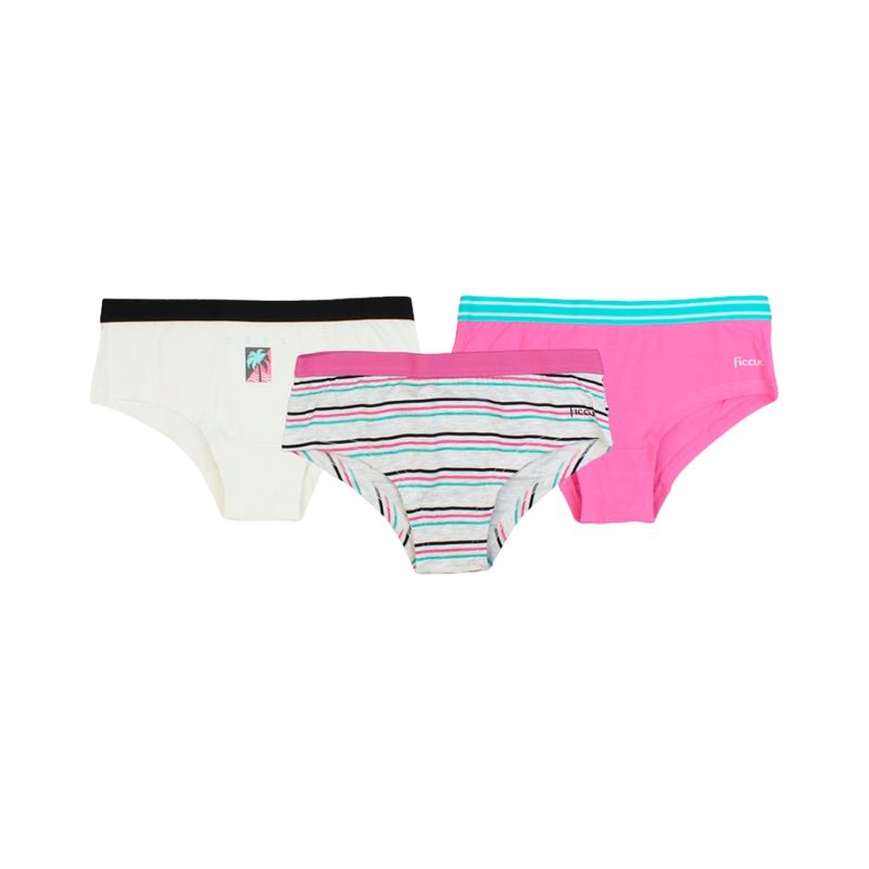 Este pack de tres bombachas para niña ofrece comodidad y estilo juvenil, ideal para adolescentes que buscan prendas prácticas y coloridas. Cada bombacha presenta un diseño diferente para combinar con distintos looks: una blanca con estampado de palmera, otra con rayas horizontales en rosa, negro y turquesa, y una fucsia lisa con cinturilla combinada en turquesa y blanco. El diseño tipo teens está pensado para un ajuste cómodo, moderno y adecuado al movimiento diario.
