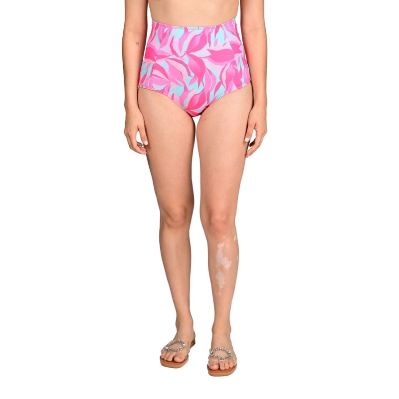 Bombacha de bikini de talle alto diseñada para ofrecer comodidad, estilo y un ajuste favorecedor. Presenta un estampado vibrante de hojas en tonos rosa, fucsia y turquesa, que aporta frescura y modernidad al look de playa o piscina. La cintura alta proporciona control abdominal, realzando la silueta y ofreciendo un ajuste seguro. Su cobertura clásica asegura confort durante el uso, permitiendo libertad de movimiento y un diseño elegante que combina fácilmente con distintos tops de bikini.