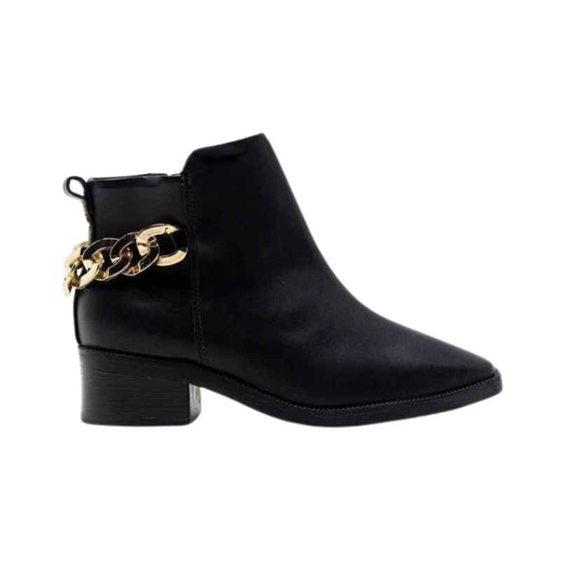 La Bota Cadena Corta Mujer Vizzano es un calzado moderno que combina elegancia y un toque de estilo urbano. Su acabado mate aporta sofisticación, mientras que la punta ligeramente afilada y el tacón de bloque bajo garantizan comodidad y estabilidad. El detalle distintivo de este botín es la cadena decorativa dorada de eslabones gruesos que rodea el talón y el tobillo, aportando un toque glam rockero y único.