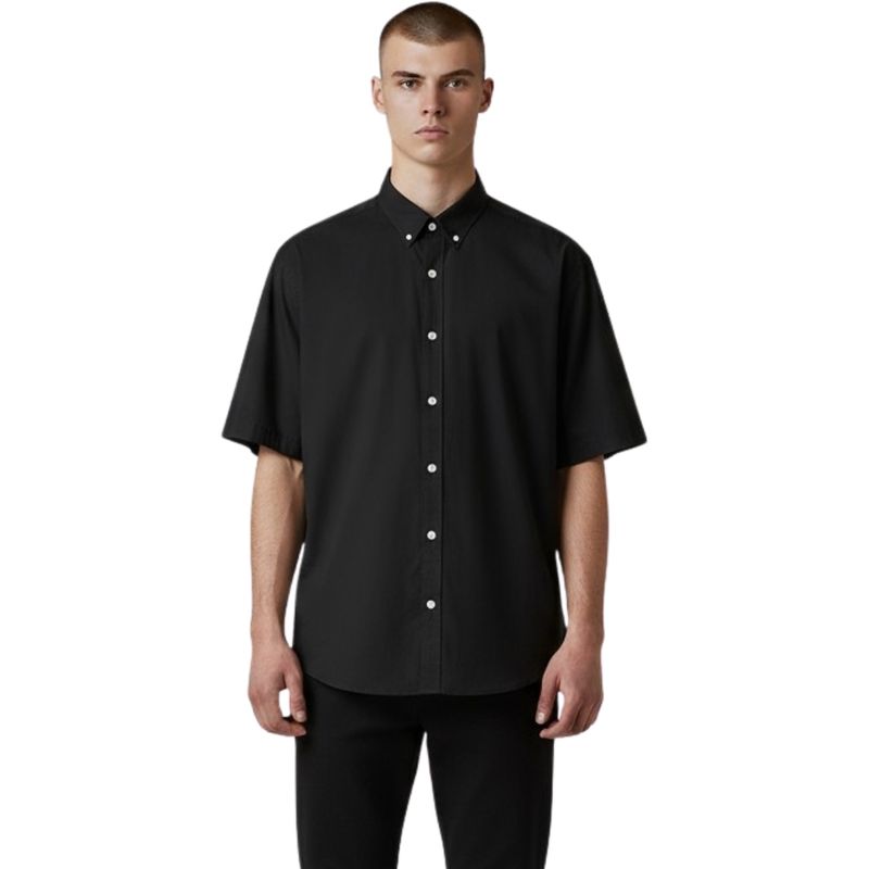 Camisa de manga corta para hombre en un elegante tono negro, con diseño clásico y versátil. Su corte regular ofrece comodidad y libertad de movimiento, mientras que el cuello abotonado (button-down) y el cierre frontal de botones aportan un detalle elegante y funcional. Ideal para combinar con atuendos casuales o informales, manteniendo un look cuidado y sofisticado.