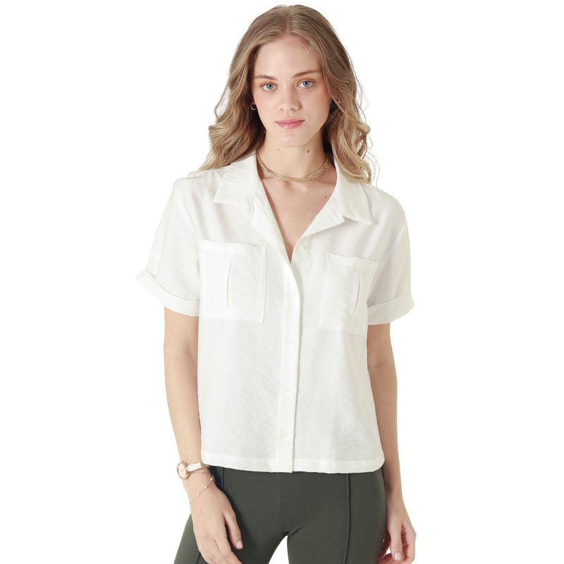 La Camisa Manga Corta Con Textura de la marca Fuera De Serie es una prenda femenina con un diseño cuidado, moderno y funcional. Presenta un cuello sport, ideal para lograr un look relajado pero con estilo. Incluye una botonera frontal completa, bolsillo tipo parche con fuelle en el pecho, y un detalle de almilla en la espalda que aporta estructura y mejora el calce. Los puños con guarda polvo en las mangas cortas refuerzan el carácter delicado y bien terminado de la prenda. Su textura sutil le da una apariencia refinada que se adapta tanto a contextos informales como a combinaciones más formales.