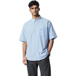 Camisa de manga corta para hombre con diseño clásico y elegante. Presenta un patrón de cuadros en tonos celestes que aporta un estilo fresco y versátil. Cuenta con un bolsillo frontal que añade funcionalidad sin comprometer la estética de la prenda, ideal para un look casual y refinado a la vez.