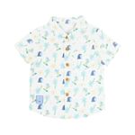 La Camisa Holiday Blanco Playero de Ficcus está diseñada especialmente para niños que buscan comodidad y estilo en su vestimenta diaria. Confeccionada en punto, esta camisa de manga corta presenta un cuello italiano clásico con solapa y cierre frontal de botones de madera que facilitan poner y quitar la prenda. Su estampado único combina palmeras, soles, olas con textura punteada y divertidos dinosaurios surfeando, creando un look alegre y aventurero. El pequeño bolsillo de parche con detalle de etiqueta en el pecho izquierdo y el bajo ligeramente redondeado completan un acabado cuidado y moderno. Ideal para actividades urbanas, paseos familiares o eventos casuales.