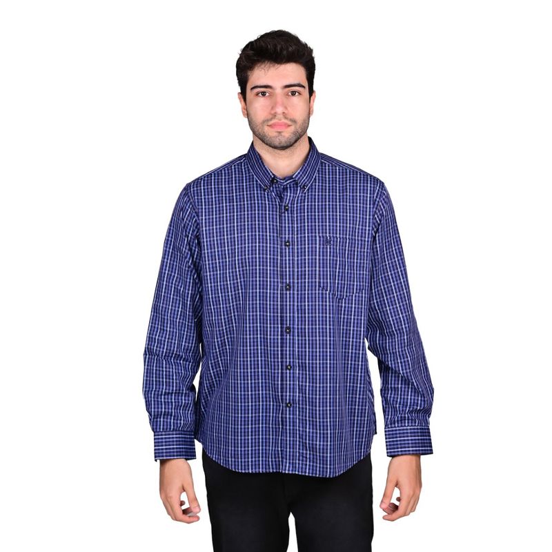 Camisa para hombre de manga larga con un diseño de cuadros pequeños en tonos azules, ideal para un estilo casual con un toque de elegancia. Incluye cuello abotonado que le otorga un acabado prolijo y estructurado, junto con un bolsillo funcional en el pecho que suma practicidad al diseño. El cierre frontal con botones completa esta prenda versátil, perfecta para el uso diario o para situaciones semiformal.