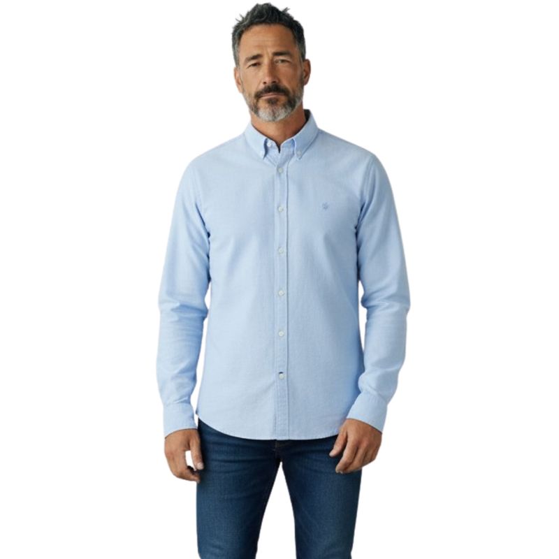 Camisa de vestir para hombre con manga larga y un elegante tono celeste. Su diseño clásico incluye cuello abotonado (button-down) y cierre frontal de botones, con puños abotonados que aportan un detalle sofisticado. Ideal para combinar con atuendos formales o casuales, ofreciendo un look pulido y versátil para diferentes ocasiones.