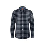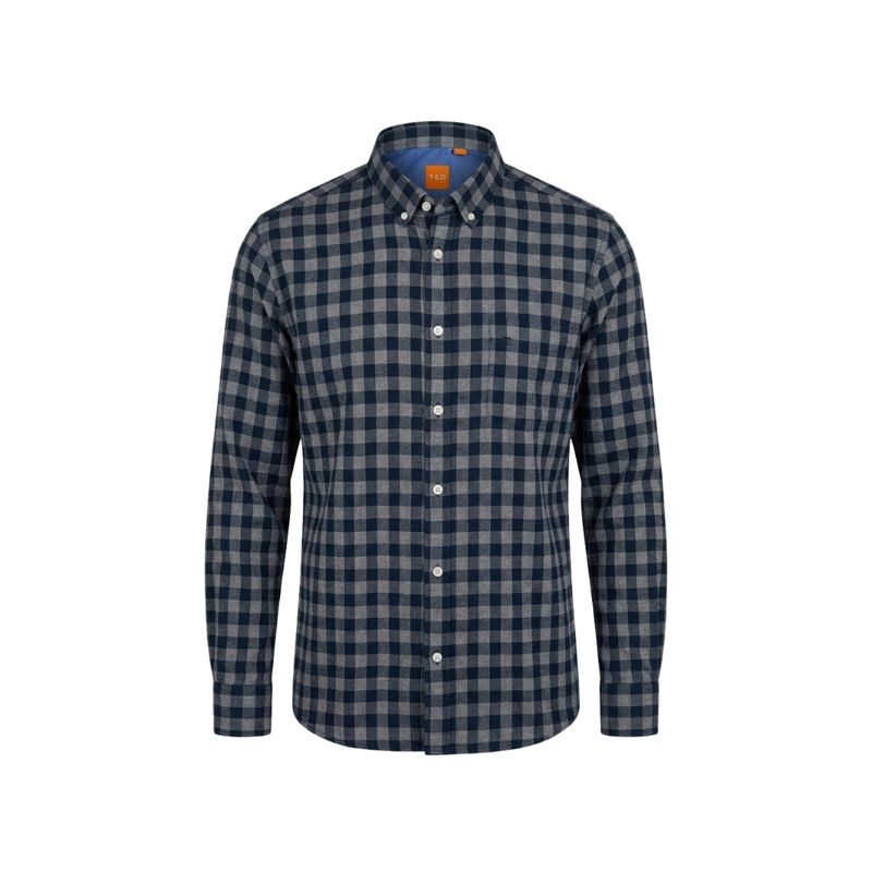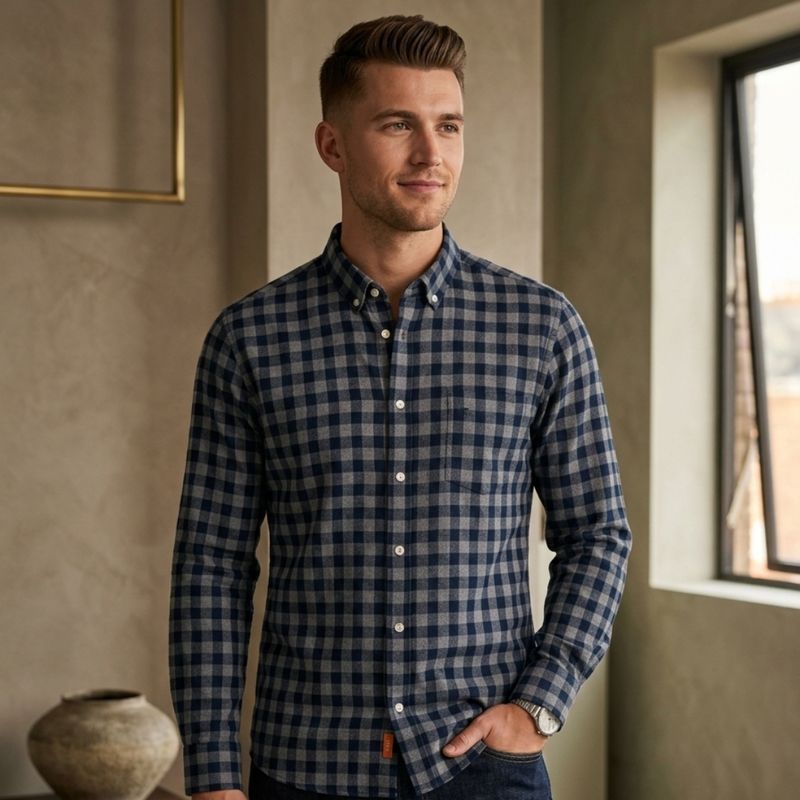 Esta camisa de manga larga para hombre combina un diseño casual y moderno con un patrón de cuadros en azul marino y gris. Su cuello tipo button-down y los botones blancos a contraste aportan detalles elegantes que realzan el estilo general de la prenda, ideal para la temporada invernal y para looks casuales o de oficina relajados.