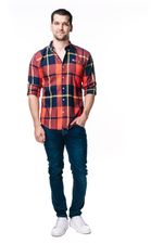 Camisa mangas largas a cuadros con un bolsillo oculto. Botón adicional en las mangas para remangarla