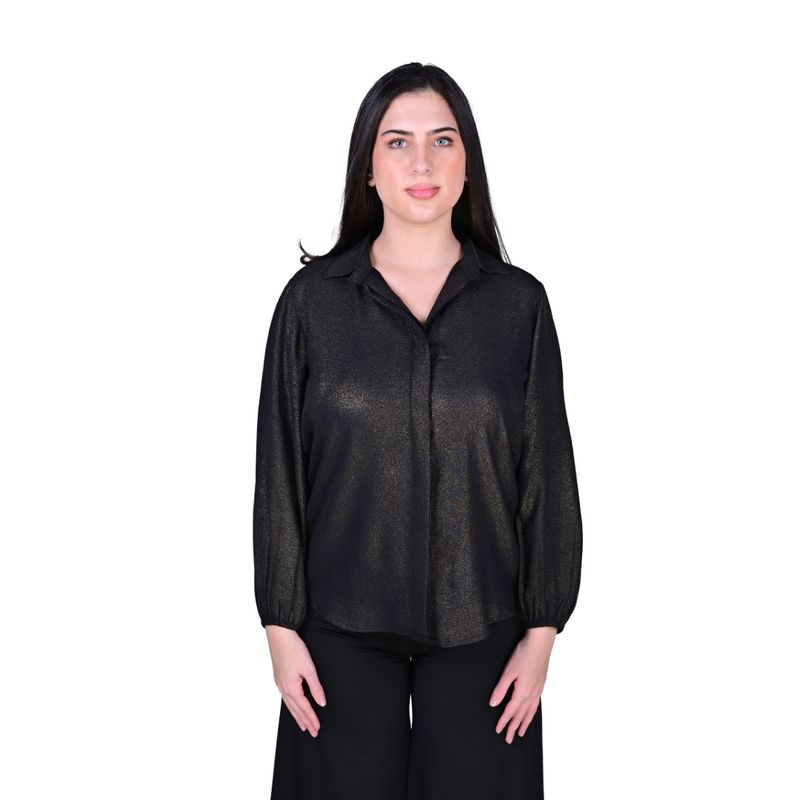 La Camisa Manga Larga En Crepé Laminado Negro Mujer L'exclusif es una prenda sofisticada que combina elegancia y modernidad. Su base negra con sutiles destellos dorados aporta un toque de brillo discreto y sofisticado, ideal para ocasiones especiales o para dar un estilo refinado a tus outfits diarios. Cuenta con un clásico cuello de solapa y mangas largas abullonadas con puños elásticos que brindan volumen y comodidad. El corte presenta un diseño ligeramente más largo en la parte trasera, aportando un detalle de estilo y comodidad adicional. El cierre frontal con botones permite un uso práctico y un acabado pulcro.