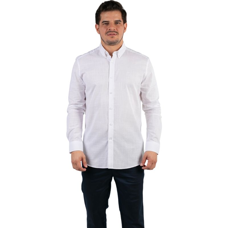 La Camisa Manga Larga Liso Blanco de Oscar De La Renta para hombre combina elegancia, versatilidad y sofisticación en una prenda imprescindible para cualquier guardarropa masculino. Su diseño liso en color blanco aporta un estilo clásico y atemporal, ideal tanto para ocasiones formales como para looks casuales elegantes. El cuello abotonado proporciona un acabado pulcro y refinado, mientras que la hilera central de botones blancos garantiza un cierre seguro y estético. El tejido incluye un sutil patrón de cuadros finos que aporta textura sin perder la sobriedad del color, creando un equilibrio perfecto entre discreción y detalle de diseño. Los puños están cerrados con un solo botón, permitiendo un ajuste cómodo y manteniendo un aspecto limpio y elegante.