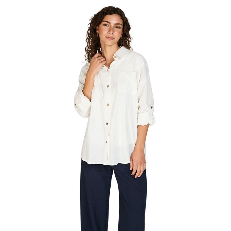 Diseño Funcional y Versátil: El corte holgado y ligero proporciona comodidad excepcional y libertad de movimiento, creando una silueta relajada pero elegante. Las mangas largas incluyen una característica práctica y estilística única: pueden sujetarse con una tira y botón, permitiéndote adaptar el largo de las mangas según la ocasión, el clima o tu preferencia personal.