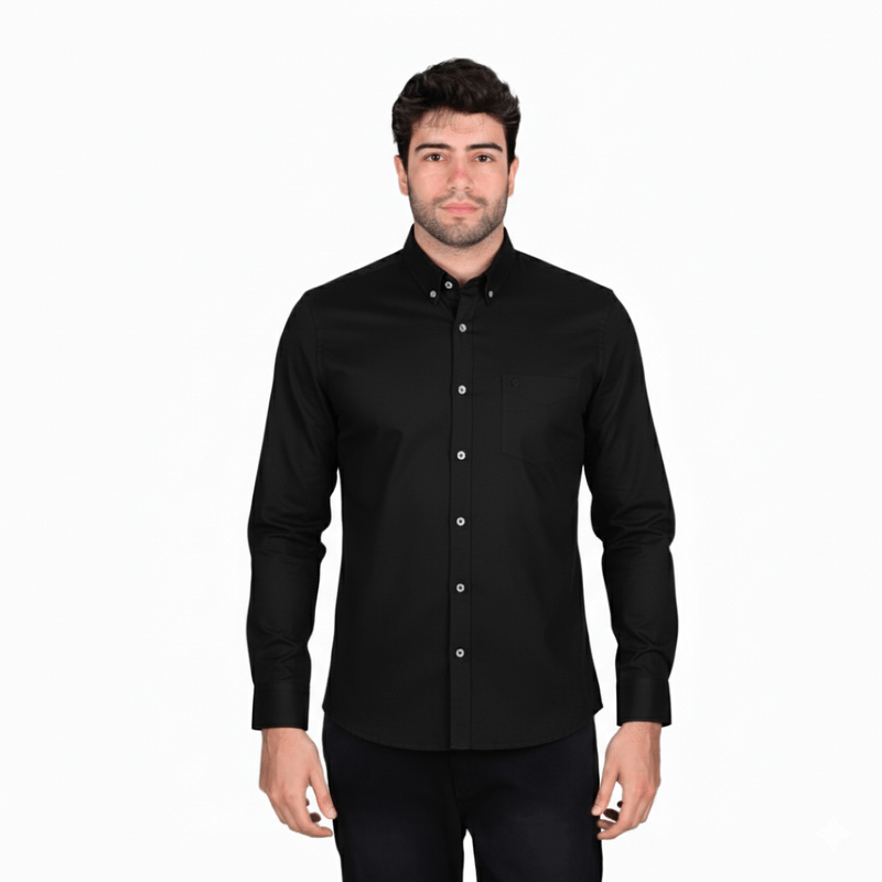 La Camisa Manga Larga Negra Hombre Oscar De La Renta es una prenda elegante y versátil, ideal para ocasiones casuales o semi-formales. Su cuello abotonado (button-down) proporciona un acabado pulido, mientras que los botones frontales blancos generan un contraste sutil que resalta el diseño de la camisa.