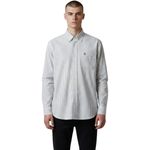 Camisa de manga larga para hombre con diseño de rayas verticales texturizadas en gris y blanco, que combina un estilo clásico con un toque moderno y sofisticado. Su corte regular proporciona comodidad y libertad de movimiento, mientras que el cuello abotonado (button-down) aporta un detalle elegante y versátil, ideal para ocasiones formales o informales.
