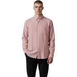 Camisa de manga larga para hombre con diseño de rayas verticales texturizadas en rojo y blanco, que combina un estilo clásico con un toque moderno. Su corte regular ofrece comodidad y libertad de movimiento, mientras que el cuello abotonado (button-down) permite un look elegante y versátil, ideal para ocasiones formales o informales.