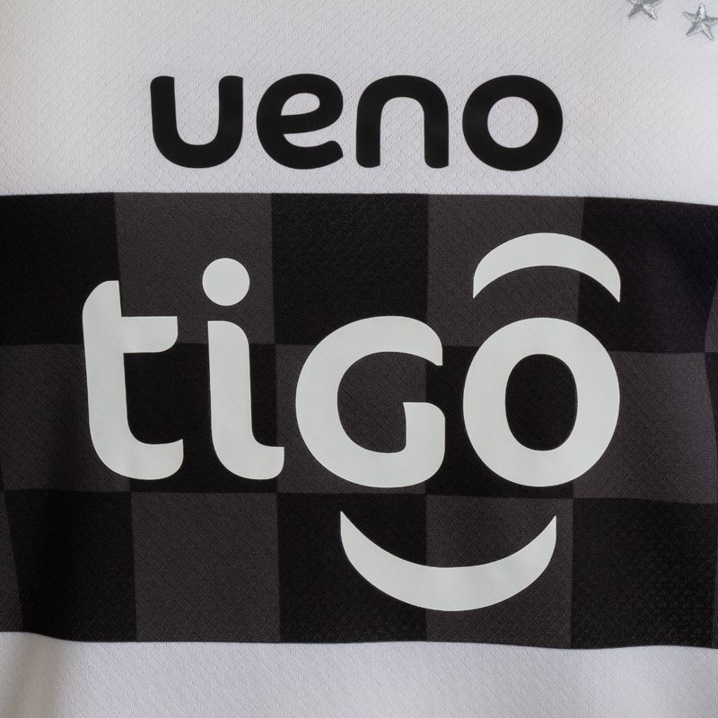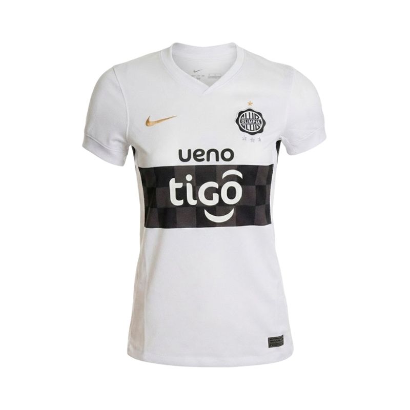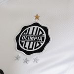 El diseño mantiene el clásico color blanco del Olimpia, acompañado por una franja frontal negra con patrón cuadriculado que aporta un toque contemporáneo y distintivo. En el pecho se destaca el escudo oficial del club junto a la estrella dorada y tres estrellas plateadas, homenajeando los máximos logros internacionales de la institución.