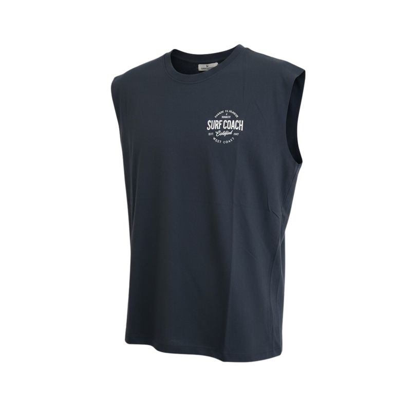 Camisilla sin mangas para hombre, de corte regular y cuello redondo, diseñada para brindar comodidad y libertad de movimiento. El frente presenta un pequeño logo redondo blanco de estilo surf, mientras que la espalda luce un estampado grande en blanco con el texto "SURF COACH Certified" acompañado de detalles referentes a Biarritz y West Coast, ofreciendo un diseño atractivo y con inspiración playera.