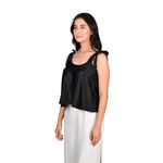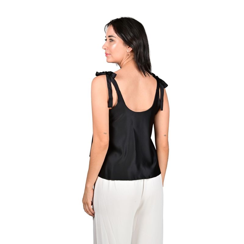 Camisilla femenina en color negro satinado, diseñada con tirantes sin mangas y escote redondo, ideal como prenda básica de elegancia atemporal. Su corte fluido brinda comodidad y libertad de movimiento, mientras que los tirantes ajustables con lazo en los hombros agregan un detalle delicado y femenino. Perfecta para combinar con pantalones de vestir, faldas o shorts en looks nocturnos y sofisticados.