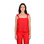 Se recomienda combinar la camisilla con pantalones o faldas en tonos neutros para resaltar el vibrante color rojo. Calzados tipo champion elegantes o sandalias de tacón completan un look armonioso y sofisticado. Accesorios discretos y delicados permiten destacar el encaje sin restar protagonismo al diseño.