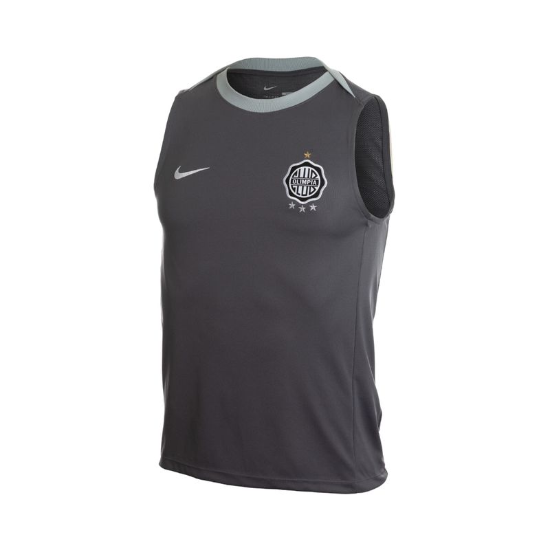 Su diseño presenta un gris oscuro como color principal, complementado con detalles en gris claro en el cuello y la zona superior de la espalda, logrando un contraste elegante y sutil. En el pecho se luce el escudo oficial del Club Olimpia con gran definición, acompañado por la estrella dorada y las tres estrellas plateadas que celebran los mayores logros internacionales. El logo del patrocinador técnico en tono claro completa el diseño de manera equilibrada y profesional.