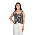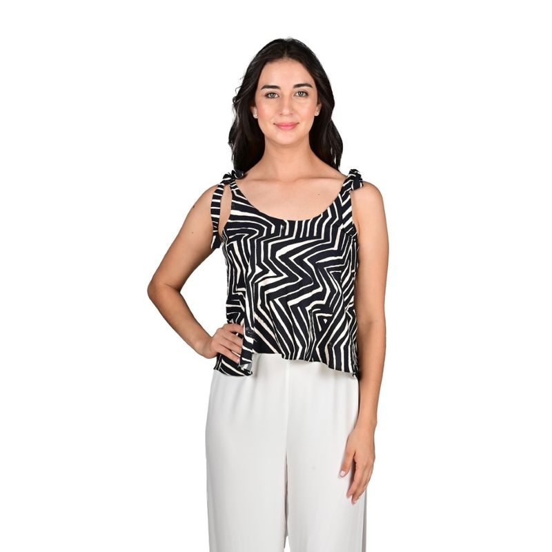 Esta camisilla de mujer destaca por su diseño moderno y vibrante, perfecta para quienes buscan un look actual y llamativo. Presenta un estampado gráfico en blanco y negro estilo zigzag que aporta dinamismo y carácter a la prenda. Cuenta con cuello redondo y tirantes de lazo ajustables que permiten un ajuste cómodo y personalizado, además de un estilo delicado y femenino. Su corte sin mangas brinda frescura y libertad de movimiento, ideal para combinar con pantalones, shorts o faldas para un conjunto equilibrado y moderno.