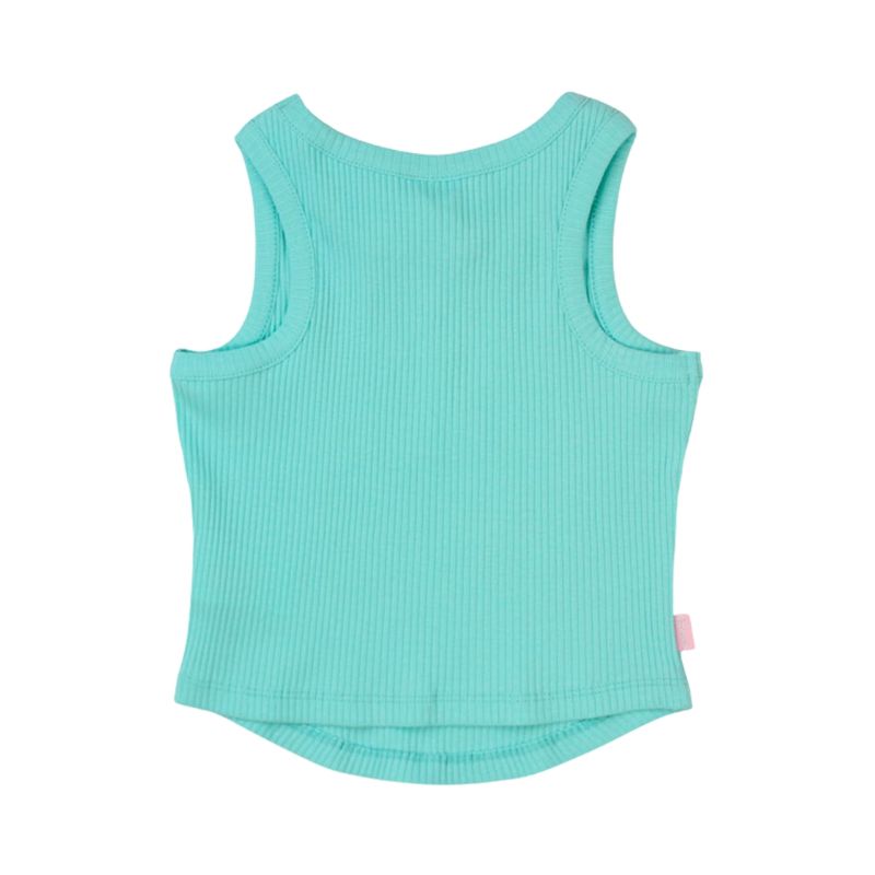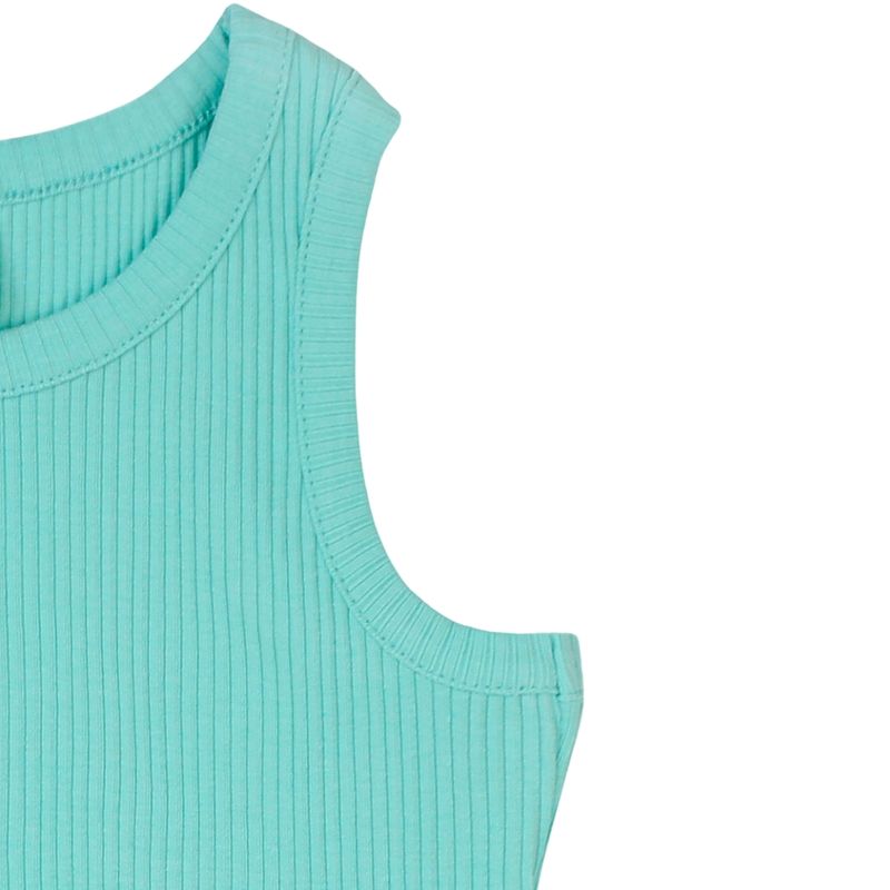 La Camisilla Rib Holiday Turquesa Niña Ficcus es una prenda versátil y moderna diseñada para brindar comodidad y estilo a las niñas en sus actividades diarias. Su corte sin mangas tipo tank top y estilo cropped permite libertad de movimiento, mientras que su bajo curvado (cola de pato) agrega un detalle delicado y actual al look.