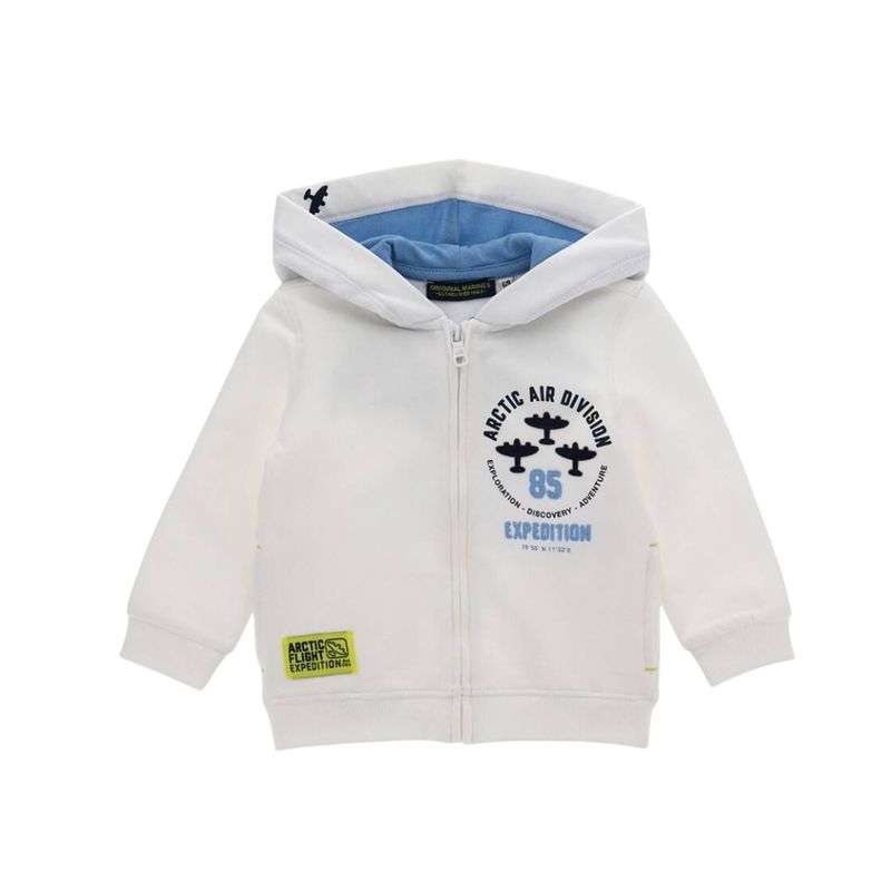 La Campera Estampada Arctic Air Blanco Niños Original Marines es una prenda que fusiona diseño contemporáneo con una estética inspirada en la aviación. El destacado estampado circular en la espalda con la leyenda "ARCTIC AIR DIVISION", ilustraciones de aviones y el número 85 en el centro, aporta una identidad única y aventurera que estimula la imaginación de los más pequeños. Es una pieza ideal para niños con espíritu curioso y activo, que buscan comodidad sin dejar de lado el estilo.