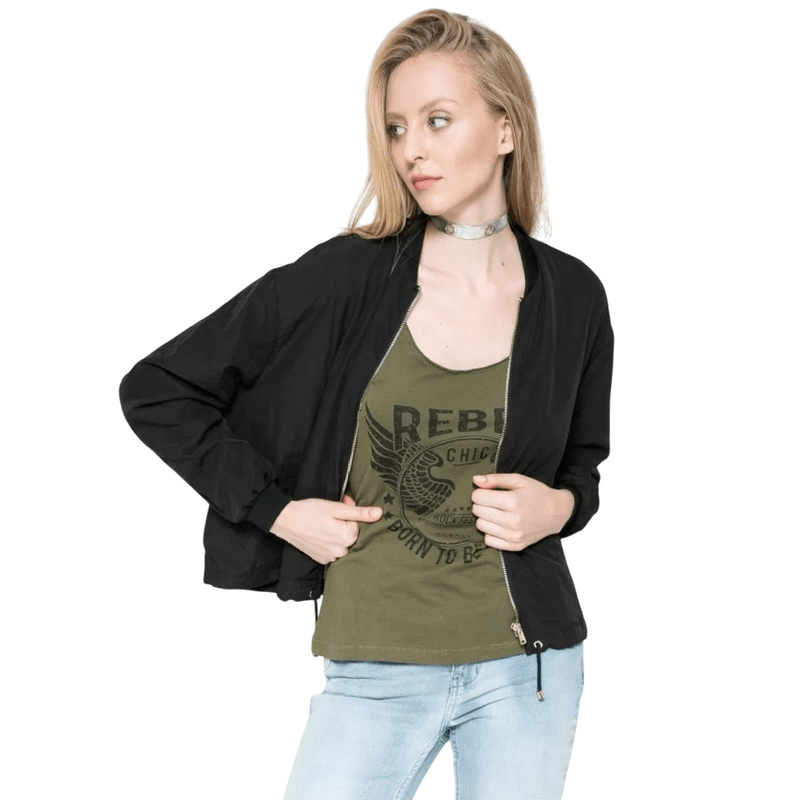 Cazadora bomber de la colección Jacqueline de Yong. Un modelo ligero fabricado en material liso. - Modelo forrado y sin aislamiento. - Diseño sencillo. - Mangas rematadas con puños. - Bolsillos interiores. - Cierre de cremallera. - Tejido liso. - Tejido fino y no elástico. - En la parte inferior de la cuerda. - Largo de manga: 54 cm. - Largo: 57 cm. - Ancho bajo los brazos: 59 cm. - Ancho en los hombros: 49 cm.