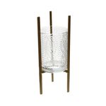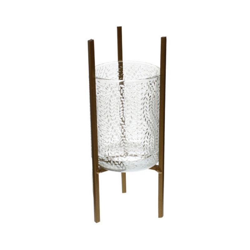 El recipiente principal está fabricado en vidrio transparente con un relieve texturizado que simula hojas o espigas,resistente con acabado dorado mate o bronce, asegurando durabilidad y estabilidad.