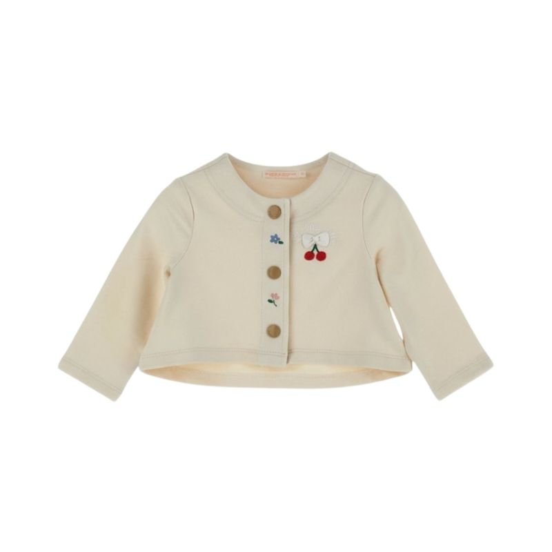El cardigan manga larga de Original Marines combina ternura, calidez y estilo en una prenda perfecta para las más pequeñas. Su diseño delicado destaca por el bordado de cerezas, lazo y flores en el pecho, que aporta un toque alegre y encantador, ideal para complementar cualquier conjunto infantil. El cuello redondo sin solapas brinda un acabado clásico y cómodo, mientras que el cierre frontal con botones de madera añade un detalle natural y distintivo que resalta la calidad del diseño.