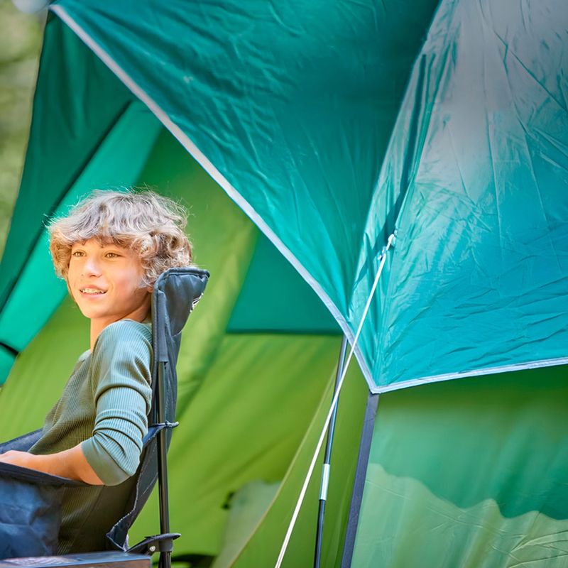 La estructura está compuesta por varillas de fibra de vidrio resistente, pensadas para ofrecer estabilidad y durabilidad. El interior de poliéster transpirable mejora la comodidad, mientras que el suelo de polietileno con diseño tipo bañera aporta una barrera adicional contra la humedad.