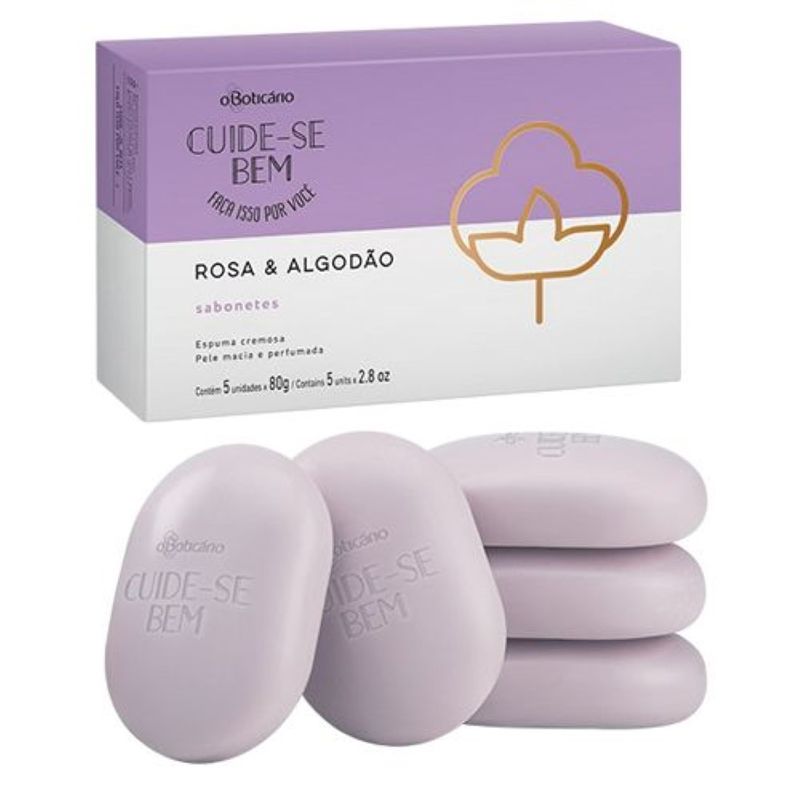 Jabón en Pastilla Cuide-se Bem Quinteto Rosa y Algodón, 5 unidades de 80 g cada uno El Jabón en Pastilla Cuide-se Bem Quinteto Rosa y Algodón viene con 5 jabones en barra con extractos naturales de rosa y algodón.
