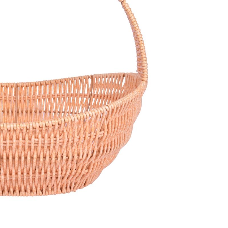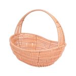 Cesta de mimbre con forma ovalada, elaborada con tejido trenzado de color natural que aporta un estilo rústico y elegante. Incluye un asa alta y curva, facilitando su transporte y manejo.