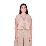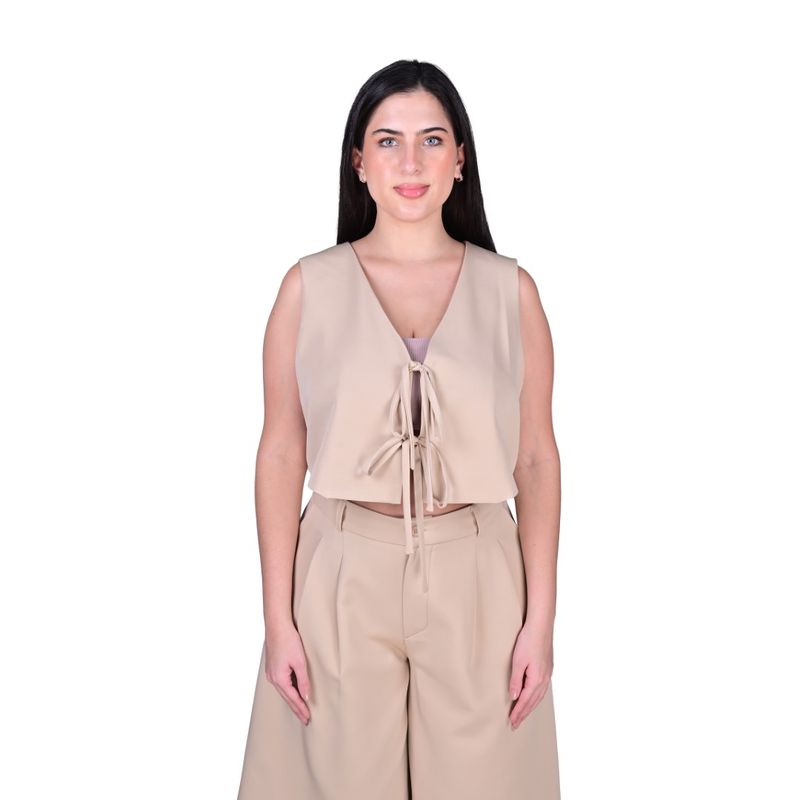 Este chaleco corto para mujer presenta un diseño sencillo y elegante en color beige. Su escote en V pronunciado aporta un toque de sofisticación, mientras que las dos cintas largas en la parte delantera permiten ajustar el cierre al cuerpo para mayor comodidad y versatilidad. La espalda tiene un corte alto que brinda un acabado pulcro y moderno.