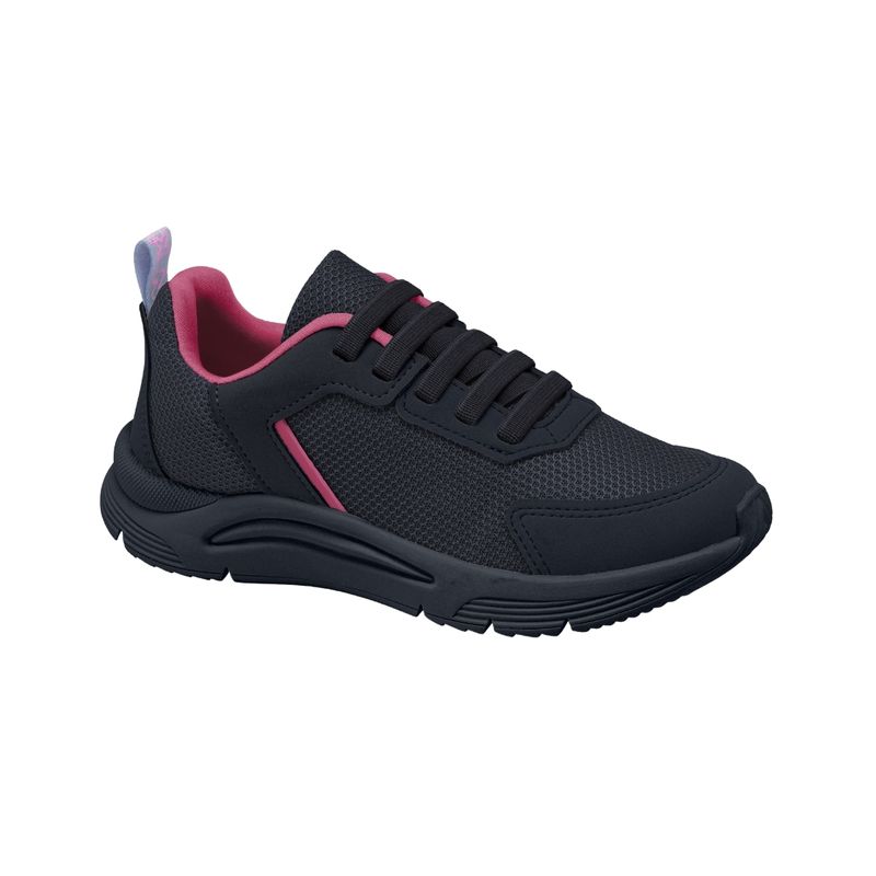 El Champion Azul Marino New Sport de Klin para niña es un calzado deportivo moderno y funcional, ideal para actividades recreativas y uso diario. Su diseño combina malla transpirable en azul marino con cordones planos negros, detalles en rosa fucsia en el borde del cuello y una línea decorativa lateral que añade un toque de estilo. La suela gruesa completamente oscura proporciona estabilidad y amortiguación, mientras que la trabilla de tela en el talón con un detalle lila facilita colocar y retirar el calzado con facilidad.